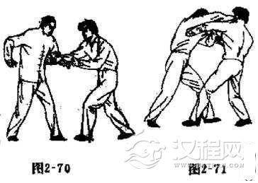 对方用右、左两手直拳,向我脚部连击时,我可用里分手以迎击。当对方右直拳将要接近我胸部时,我用左手由左外侧,向左内侧下按对方右小臂。在对方的左直拳,随之又将要接近我胸部之际,我接连用右手由右外侧,向右内侧下按对方左小臂。在对方两小臂被我按下之后,我随用左右两手圈锤,连击对方头部两侧。在步法上一可随两手的连击动作,相机而动,其它动作要领与里分手的练法相同(如图2.68, 2-69, 2-70, 2-71)。