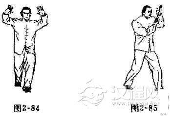 下身姿势与头撞法的练法相同。上身姿势是身形中正,两臂抬起,曲肘环抱,肩撑肘横。两手外翻,手心向前,指尖向上,两手与眉同高,两手与自身头部距离约有3拳。左手由左外侧立掌右推。右手由右外侧立掌左推。推两掌时,两肘下坠,右肘贴于自身胸部,左手在前,右手在后。上身由正面变成斜面姿势。(如图2-84, 2-85 )