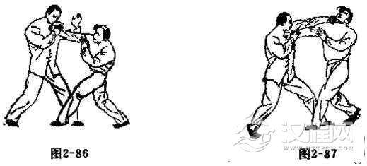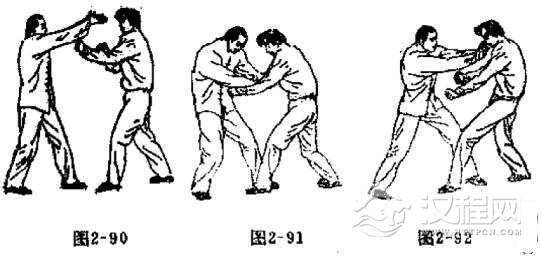 对方用两拳同时向我胃部击来时,我可用反背锤以迎击。当对方两手将要接近我胃部时,我用双手同时向下拍打,往回楼挂。随之翻手作拳,以双手拳背猛砸对方胸部。其它动作要领与反背锤的练法相同(如图2-90, 2-91,2-92)。