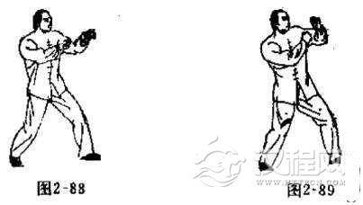 下身姿势与头撞法的练法相同。上身姿势是两臂迎面伸出,略与弯曲,手心向下,十指自然分开。两手同时下按搂挂。身形后靠,两手作半握拳状,翻手用两拳背下砸,沉肩坠肘,身往前扭。左脚随之前进半步,右脚紧跟半步(如图2-88, 2-89)。