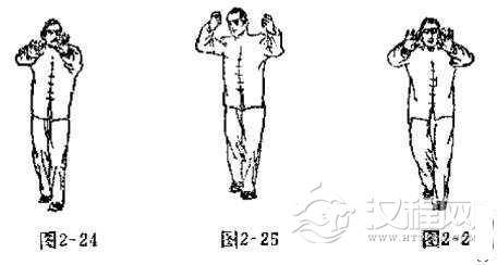 下身姿势与头撞法的练法相同。上身姿势是两臂向前迎面伸出,略有弯曲,两手心向下,十指自然分开,护住头部,左手略长右手。两手内翻,手心向内,两手拉回,用两小臂分别向左右两侧外分,随之两手外翻,手心向前,以两肩摧动两臂,以两臂摧动两手,以两手向前猛力拍打。同时左脚前进一步,右脚紧跟半步,要做到头与手齐到,步与身并进,其势凶猛,如虎扑食(如图2-24,2-25, 2-26)。