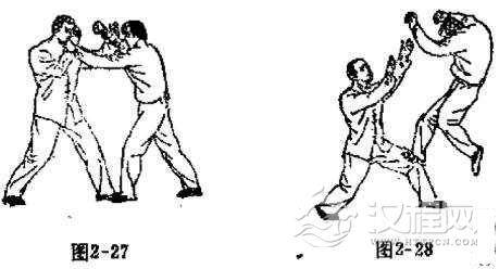 对方用双手同时向头部左右两侧击来时,我可用手打法以迎击。当对方双乎将要接近我头部时,我用两小臂的桡骨部位,同时向左右两侧将对方双小臂分开,两手外翻,以两手掌同时向对方胸部拍打。拍打时要沉肩坠肘。其它动作要领与手打法的练法相同(如图2-27、2-28)。