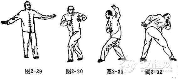 下身姿势与头撞法的练法相同。上身姿势是两臂左右分开,两臂略有弯曲,并与自身约成分90度角,两手十指自然分开,手心斜向下。周身放松,左脚前进半步,右脚紧跟一步,落于左脚后外侧,两脚成丁字步形。右脚尖与左脚外侧踝骨部位相对,中间约距离20公分。以左脚掌为轴,上身向右后方旋转,头部随之往右下方扭转。同时左手由左往上往右做弧形动作,至右肩头。右手顺势背于身后。在上身向右后方旋转时,用左胯向左撞,以胯发力,发力时要全身齐动,刚柔相济(如图2一29、2一30、2一31、2一32)。