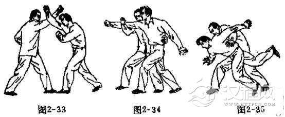 对方用右拳向我头部砸来时,我可用胯打法以迎击。当对方右拳将要接近我头部时,我用右小臂格挡对方右小臂,随之由左往右将对方右小臂下压,同时身形略向左闪,以右肘弯曲夹住对方右小臂,趁势进步欺身,用左手圈楼对方腰部,以左胯撞击对方小腹或大腿根部,左手由上往右与上身配合而动,身形向右后方旋转。其它动作要领与胯打法的练法相同(如图2-33, 2-34, 2-35)。