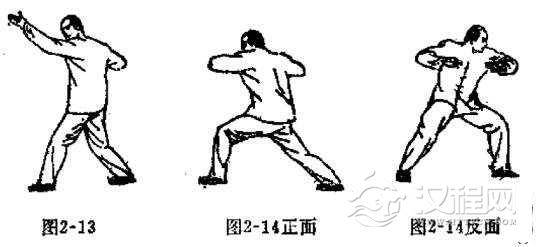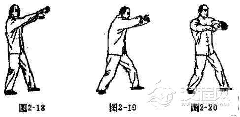 下身姿势与头撞法的姿势相同。上身姿势是两臂迎面伸出,略有弯曲,两手心向内,左手在前,右手在后,两手间的距离约有10公分,右手距离自身脚部约有3拳.两手十指自然弯曲,两肘左右外撑。两手同时往回拉至胸前,身形略往后靠。以两肩摧动两手,以两手腕部向前发力,发力时要空胸紧背,两手十指回勾,使腕部突出而有力。同时左脚前进半步,右脚紧跟半步,周身力爱均整,两手腕部似弹簧(如图2-18, 2-19. 2-20)。