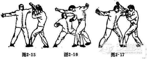 对方用右摆拳向我头部左侧击来时,我可用肘打法以迎击。当对方用右摆拳将要接近我头都左侧时,我左小臂由上往回内翻立肘,用左小臂住外格挡对方右小臂,随后回手内翻,手心向下,肘尖向前,猛撞对方胸部。其它动作要领与肘打法的练法相同(如图2一15, 2一16, 2一17)。