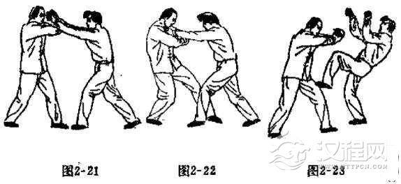 对方用双手向我面部扑来时,我可用腕打法迎击。当对方双手将要接近我面部时,我用两小臂往上迎接对方双手的腕部或小臂,使对方腕部或小臂塔在我的小臂之上,我趁势将两小臂回撤到胸前,使对方力量落空,我随之以两手腕向对方胸部发力。其它动作要领与腕打法的练法相同(如图2-21, 2-22 , 2-23)。