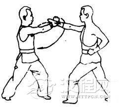 甲:左拳向右前臂伸出,再向前推送以压住乙的右腕部。同时右拳臂外旋屈肘收回腰间,脱开乙的右手。