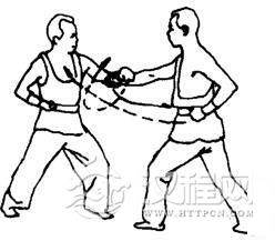 乙:左脚向前进一步成左弓步。同时右掌经内向右前方弧形穿出,从甲右举的背面搭住其右腕部,以防开甲冲来的右拳。左掌变拳,提至腰间。