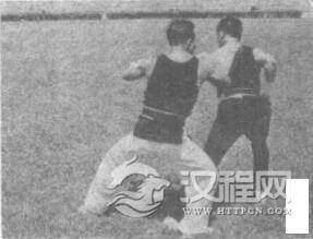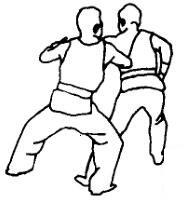 甲:左掌臂内旋抓住乙的左腕。紧接右脚向前上一步于乙左脚后落地,身体左转成马步,用右膝顶撞乙的膝窝。同时右臂屈肘上抬,用肘部向前横击乙的后腰部。