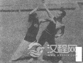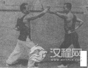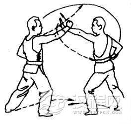 甲:上动不停,右腿蹬直成左弓步,身体略前倾。同时左桥丰向前律送成攻桥,迫使乙方上体后倒,使他失去反抗的能力。