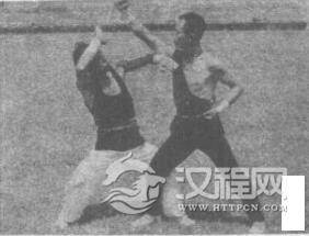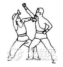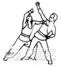 乙:右脚后撤一步成左弓步。同时左掌经内向左上方弧形穿出,以防开甲的右拳。右掌变拳收回接间。
