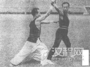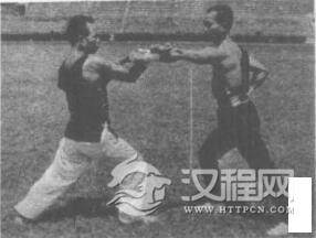 甲:右脚向右踏进,上体右转成右弓步。同时右双指顺势向右上方挑格,以防开乙的右拳。随之左双指向乙的右肋部插去。