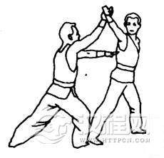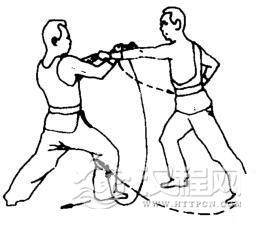 甲:右脚向前进步成右弓步。同时右掌变双指经前向前方绕行,右臂屈肘,腕后屈压住乙的左前臂,以防开乙的左拳。左拳变双指附于右肘内侧。