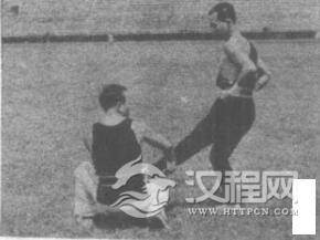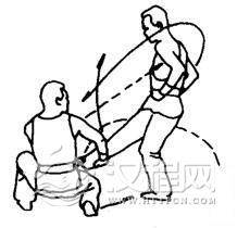 乙:左脚迅速向甲的右膝部弹踢出去。同时左拳收回腰间。