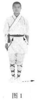 两脚并步站立,两臂下垂,掌附大腿外侧,掌心向里,身胸挺直。目视前方(图1)
