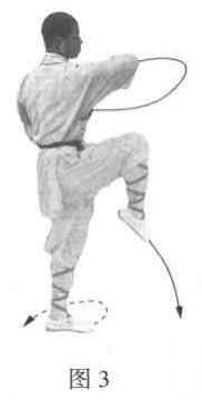 上体左转90度,抬右腿向前提膝。同时左拳变掌,向内屈肘旋腕,停左侧,再抬右拳由内向外、向上架肘抖拳,高与肩平,左掌向右屈肘推掌,护于右肘下方。目视右侧(图3)