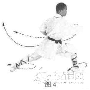 右脚下落左脚前一步,使两腿成右弓步。同时右拳向前下方屈肘砸击:左掌变拳,抱于腰间。目视前方(图4).