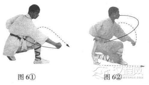 右脚移于左脚后外侧,体右转180度,两腿全蹲成歇步。同时右拳随身向右侧下方砸击,左掌变拳抱于腰间,目视右拳(图6(1)).