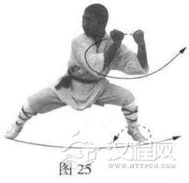 起身,以两脚为轴,体向右转90度,同时左腿迈一步,两腿半蹲成马步。两拳随身由下向上屈肘抖拳,高与肩平。目视右侧(图25)
