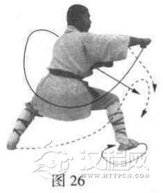 两脚向左侧横滑半步,右脚再向前落一步,体向左转180度,使两腿成高马步。同时两拳变掌,向前往后拦,然后变拳,右拳向右前方撩打,左拳向内护于右肘内。目视右侧(图26)