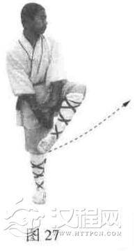 以右脚为轴,体向右转180度,抬左腿向左提膝.两拳变掌翻臂附于左脚鞋跟部(图27)