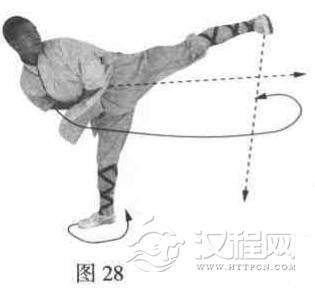 右脚支撑,左脚不落地,向左侧弹蹬,两掌相附在腹前下方。目视左侧(图28)