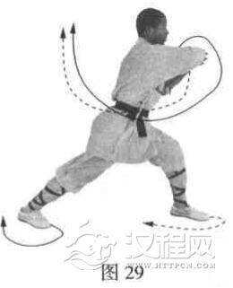 左脚下落右脚前一步,体向左转90度,使两腿成左弓步。同时右掌变拳,由外向内、向前摆肘,左掌向右、向前拍打右肘内侧(响亮)。目视右肘尖(图29)。