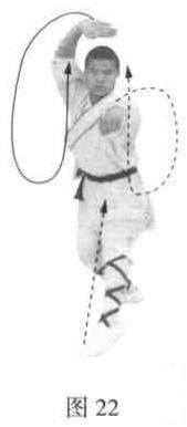 以两脚为轴,体向右转90度,收左脚落右脚前一步,提脚跟,使两腿成高虚步。同时左掌变拳,向前冲击;右掌架于头上前方,掌心向斜上方。目视前方(图22).