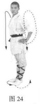 左脚下落,与右脚成并步。两手收回胸前,两臂下垂,身胸挺直,目视前方(图24)