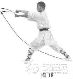 右脚下落左脚前.震脚(响亮),抬左脚向上一步成左弓步。然后左掌变拳,两拳向前冲击,拳心向下。目视两拳(图18 )