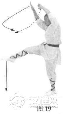 抬右脚向前、向上弹踢。同时两拳变掌,右掌向前拍击右脚,左掌向前拍在右手背上(响亮)。目视前方(图19)