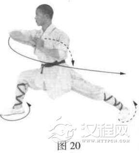 右脚下落左脚前一步,使两腿成右弓步。同时右掌变拳,向前屈肘冲出,肘尖向前;左掌贴住右拳。目视右肘(图20)