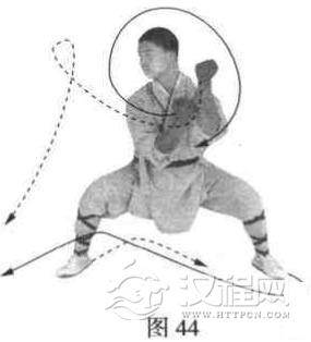 左脚后退一步,以两脚为轴,体向左转90度,两腿半蹲成马步。同时两拳由上向下屈肘抖拳。目视右侧(图44)