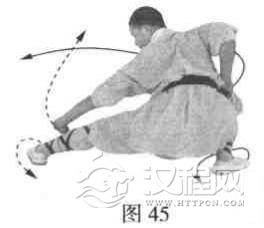 抬两脚向右转身(180度)跳步,两脚落地成左仆步,同时左拳变掌,向左侧下方撂打;右拳抱于腰间,目视左侧(图45)