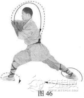 起身,以两脚为轴,体向左转90度,使两腿成左弓步。同时右拳由后向前拐肘左摆,左掌向右拍打右肘。目视右肘(图46).