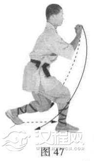 以两脚为轴,体右转180度,左脚稍向后移,使两腿成拖步.两腿微蹲。同时两拳变掌,向前抓打,然后向内翻腕变拳,屈肘冲击。目视两拳(图47)