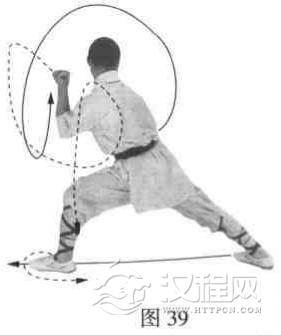 抬左脚向前上一步,体向右转90度,使两腿成左弓步。同时右拳由上向下抡一周,然后下栽阴前;左拳由下向上再反上绕一周半.屈肘抖拳,高与耳平。目视右侧(图39).
