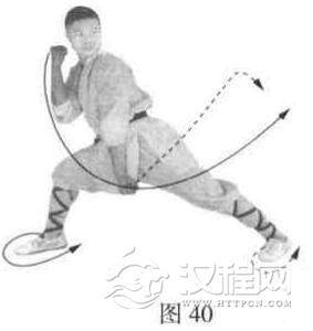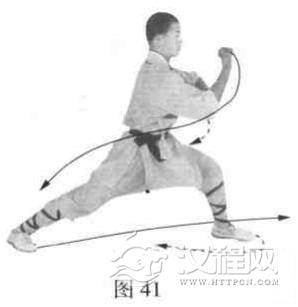 以两脚为轴,体向左转180度,使两腿成左弓步。同时右拳向前屈肘冲击;左拳变掌,向内屈肘,附于右肘上。目视右拳(图41)