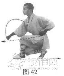 体右转180度,抬右脚后退一步,两腿全蹲。右拳向前下方劈击,左拳抱于腰间(图42)