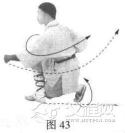 左脚向后倒一步,两腿全蹲。同时左拳向前下方劈击,右拳抱于腰间。目视左拳(图43)