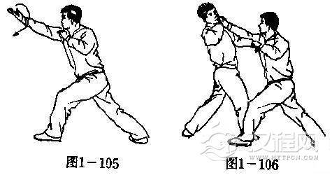 上动不停,上体左拧;同时,右掌由右腰侧向前直臂穿击,掌心向上;左掌内翻成掌心向下.回收于右肩侧。目随右手(图1一105)。