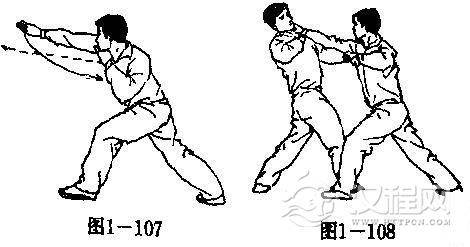 【用法】我穿插敌喉敌如上格,我则乘机转腕下锁敌喉(图1一108).