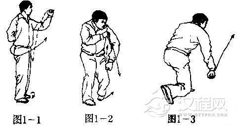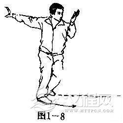 (2)两手握拳,右拳屈臂贴于腰后.左拳屈臂上举于体前,拳与鼻高,拳心向右(图1-1)