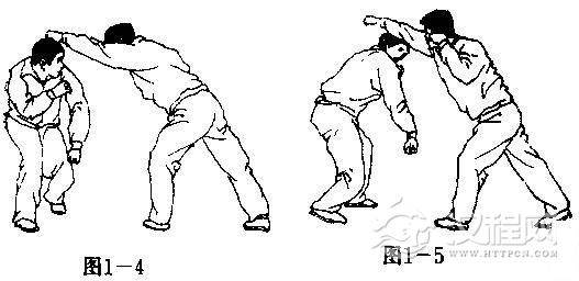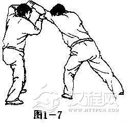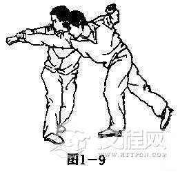 【用法】当我采制敌臂时敌必以手解脱(或屈肘向我顶挤),我则拧腰裹身避其来势,同时顺势采拿其解脱之手,并以左小臂猛靠敌肘(图1-9)
