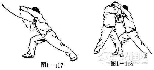 【用法】我劈敌肘敌必屈臂回挣,我则以右掌制住敌腕,以右肘顶靠敌肋,速即以左拳猛击敌头(图1-118)
