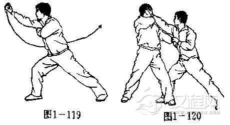 【用法】我贯击敌头,敌如格抓,我则乘机采制其腕,迅即以右拳铲击敌耳侧(图1-120).