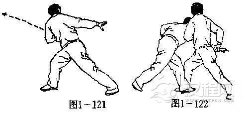 【用法】单牵跌为贴身采跌之法.我击故面故必格抓,我则就势采制其腕,并将其向找体右侧牵拽,使其跌仆(图1一122)。