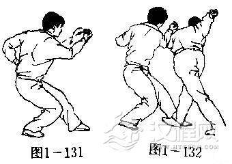 【用法】我以右掌击打敌面,敌必提肘格架,我须猛然坠肘回坐以右小臂滚压敌肘关节(图1-132):如敌转袭我下,我也可回坐闪挪以臂向下格压。