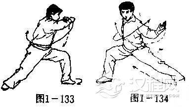 (2)上动不停,左脚跟蹬地.腰身猛然右拧成右弓步;同时,右手向右侧牵拉,左小臂随转体之势向右下方外旋滚压。目随左手(图1-134)。